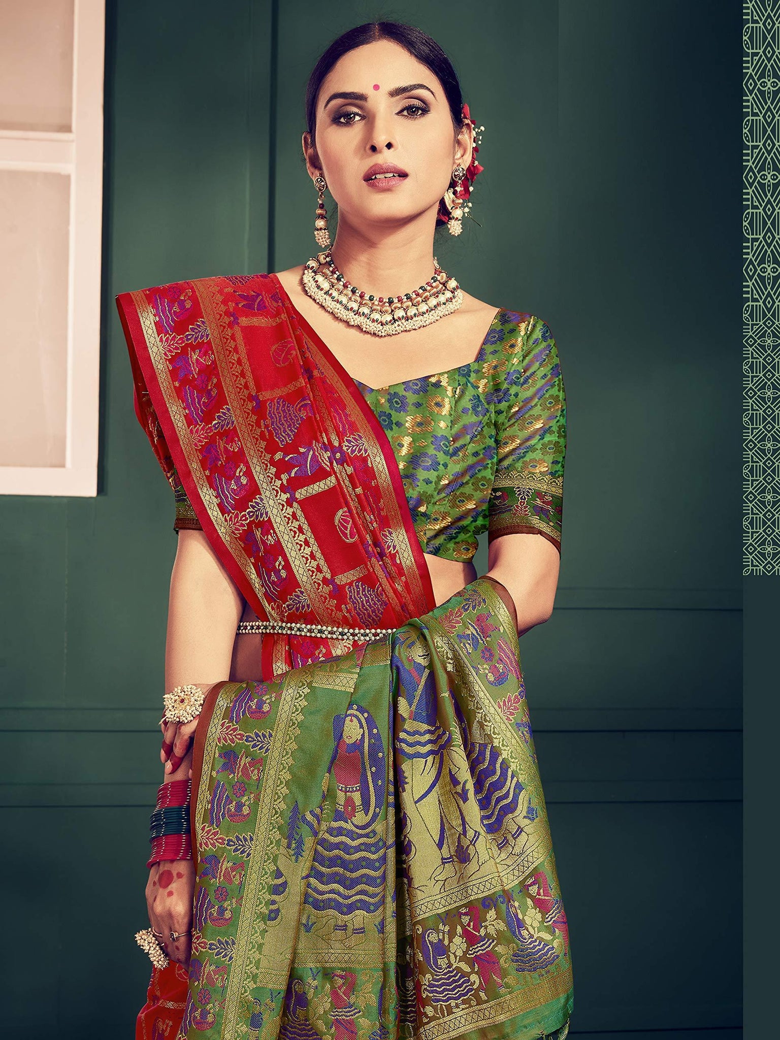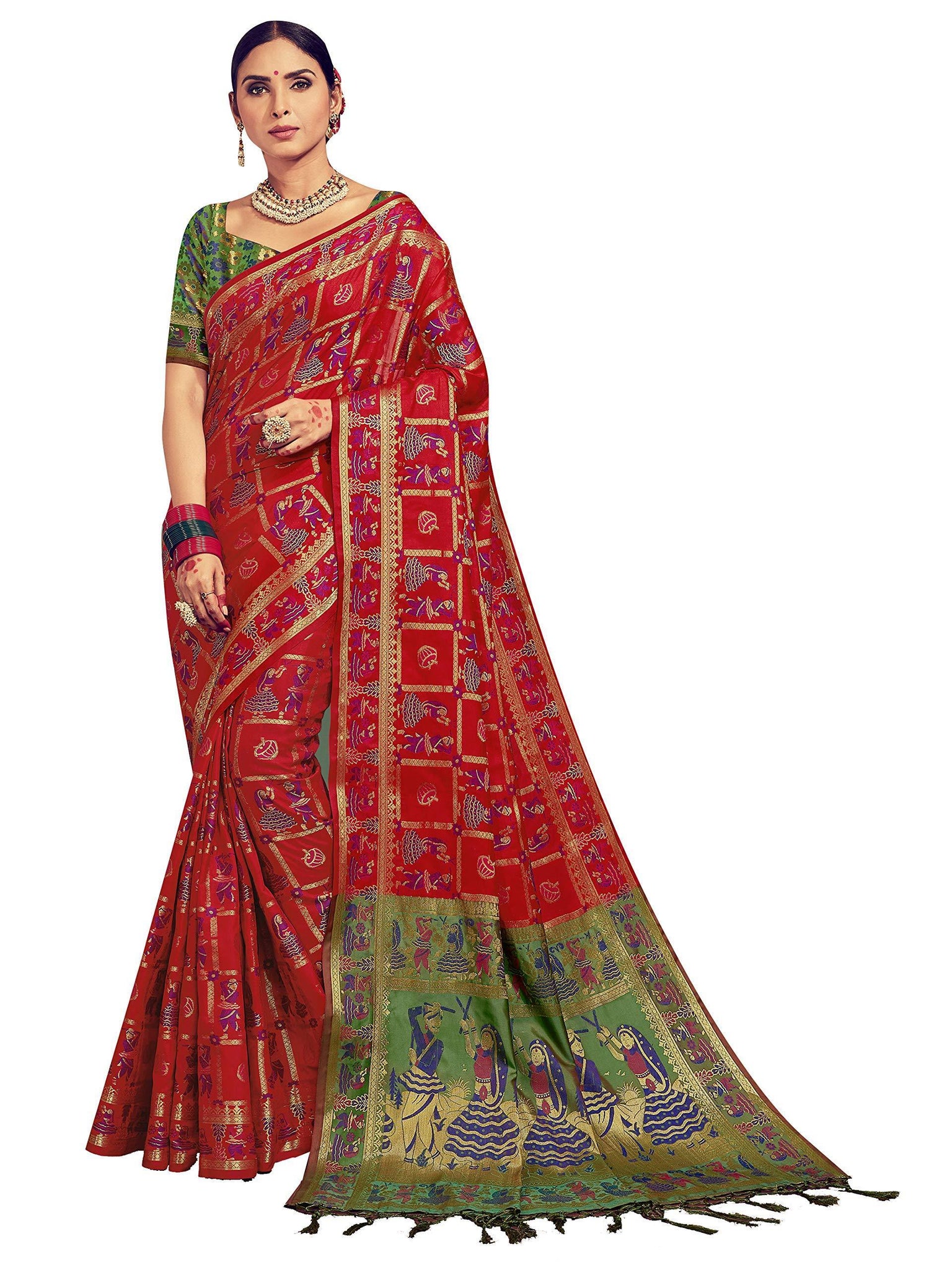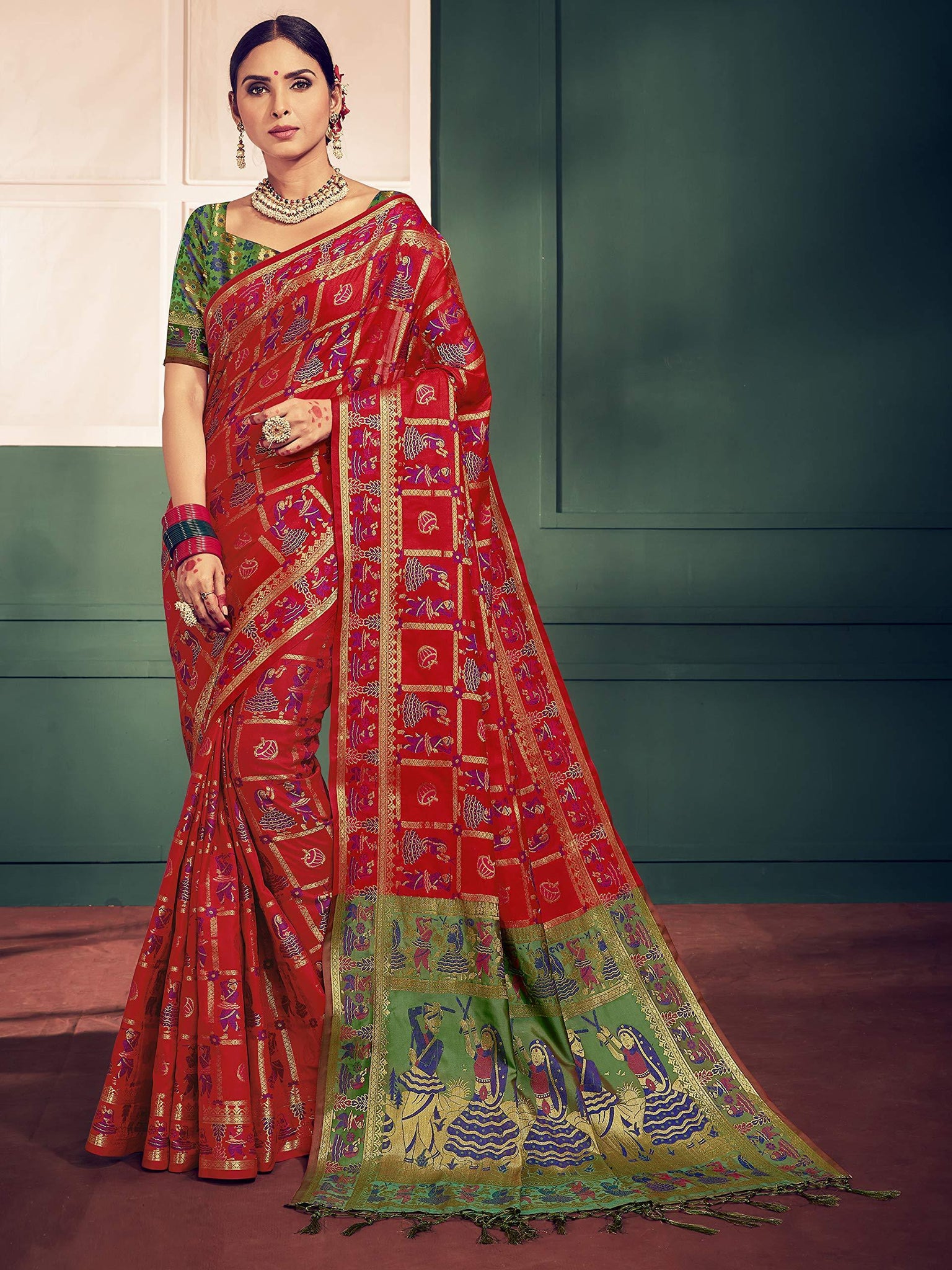 - Saree Color: Red | Blouse Color: Green