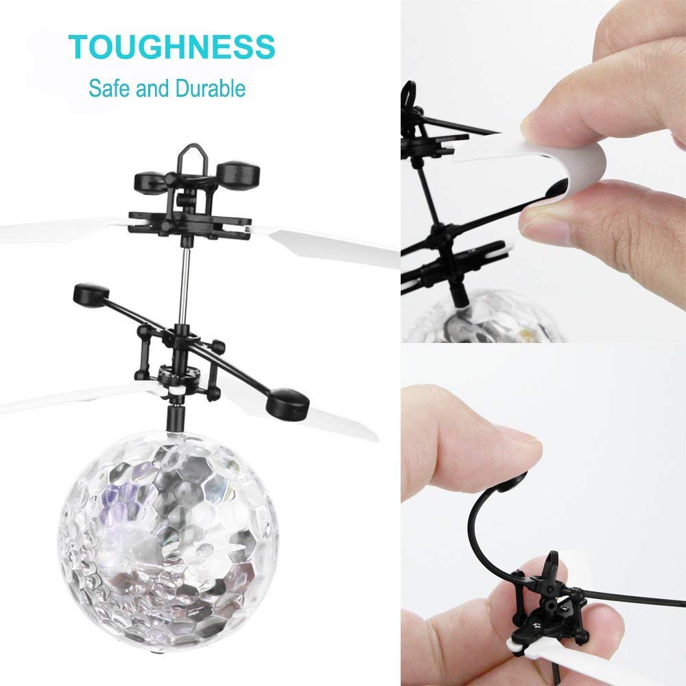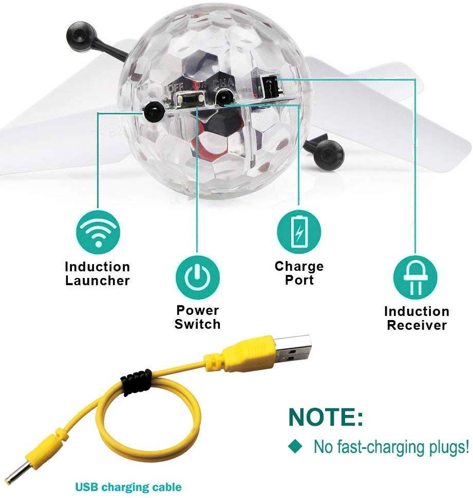 - Made of ABS Non-toxic Materials Flying Ball Toy × 1, USB Charging Cable × 1 High-flexibility Blades and Propellers It owns resistance to fall, security to use, and durability to contort Flying ball has adopted automatic power-off protection system. When the Flying ball falls down to ground or collides with other objects, the power will turn off automatically