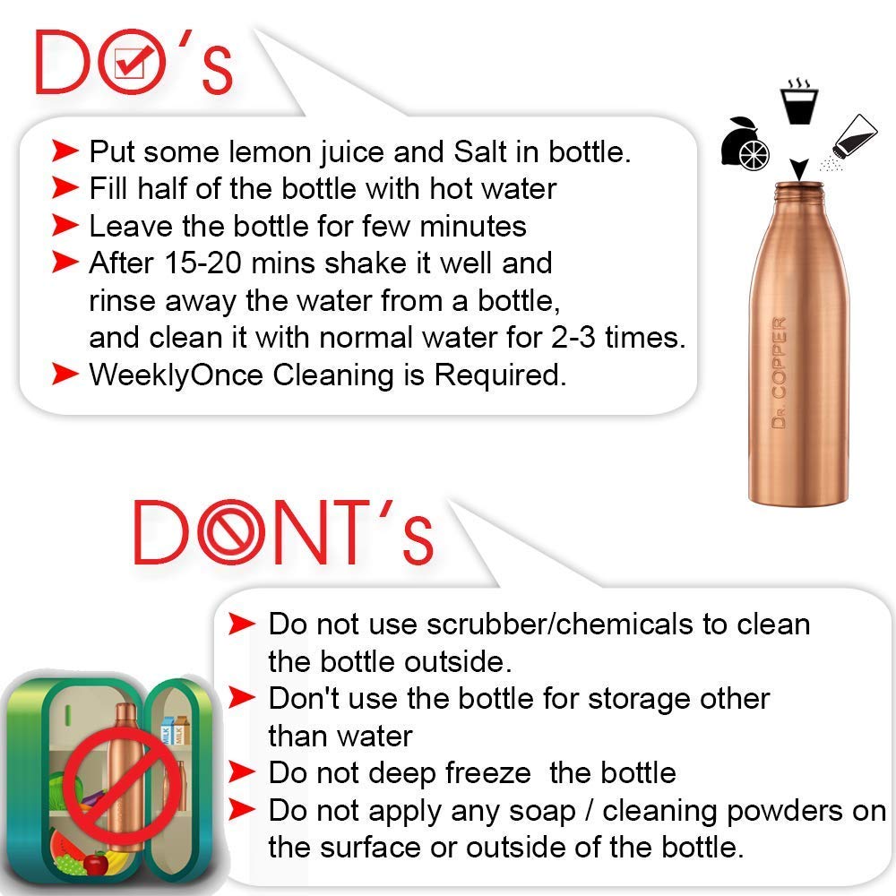 Worried that copper bottle will get tarnished easily and the inside of bottle cannot be cleaned. Our copper bottles are rust free, It has wide mouth thus making it extremely easy to clean. Just rinse with lemon water or Vinegar.