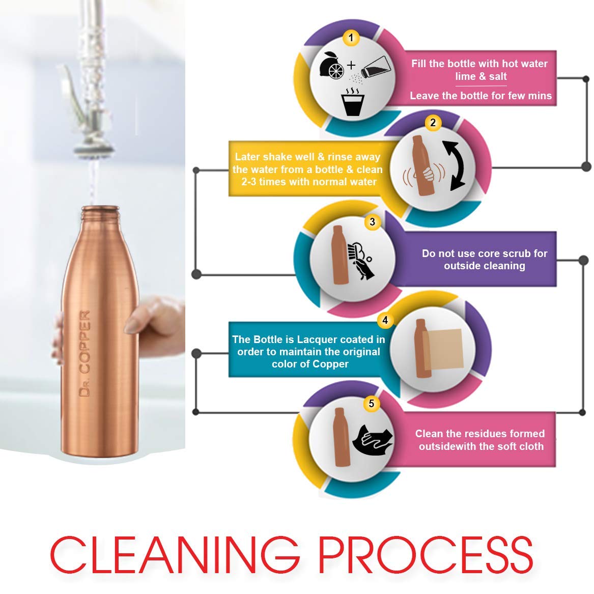 Worried that copper bottle will get tarnished easily and the inside of bottle cannot be cleaned. Our copper bottles are rust free, It has wide mouth thus making it extremely easy to clean. Just rinse with lemon water or Vinegar.