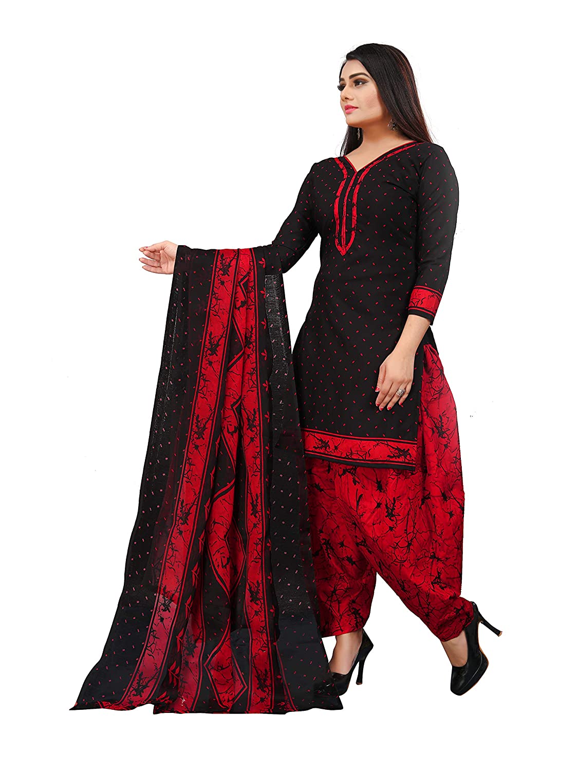 • Fabric :: Top - Cotton, Bottom - Cotton , Dupatta - Cotton , Inner - Not Available; Color :: Top - Black , Bottom - Red , Dupatta - Black And Red